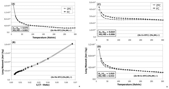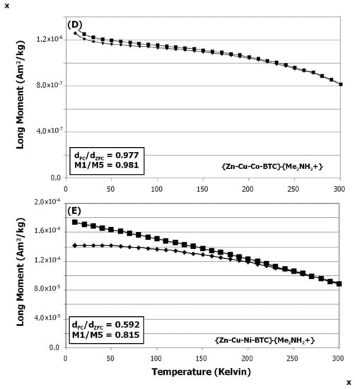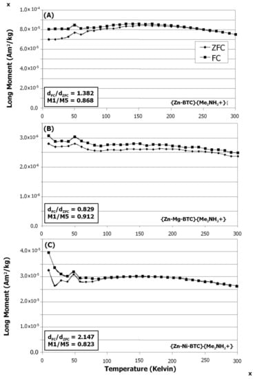 Three samples (Figure 9A–C) showed little to no dependence on temperature indicative of ferromagnetic ordering behavior. {Zn-Mg-BTC}{Me2NH2+} and {Zn-Ni-BTC}{Me2NH2+} yielded similar behaviors on warming for both the ZFC and FC experiments (Figure 9B,C). They both display a drop in remanence from 10 K to 20 K followed by little temperature dependence up to 40 K, where there is a slight increase in remanence at 50 K. On further heating, the sample showed a steady decrease in remanence from 60 K to 300 K. The FC remanence is higher than the ZFC remanence (10–22%, respectively) and for {Zn-Mg-BTC}{Me2NH2+} the two curves did not converge (Figure 9B) while for {Zn-Ni-BTC}{Me2NH2+}, the curves converged at 100 K (Figure 9C). The ratio δFC/δZFC yielded 0.829 and the M1/M5 was 0.912 for {Zn-Mg-BTC}{Me2NH2+} and δFC/δZFC was 2.147 and the M1/M5 yielded 0.823 for {Zn-Ni-BTC}{Me2NH2+}. The lack of strong field dependence for these samples on warming is diagnostic of ferromagnetic ordering behavior [54]. We note that Zn(II) and Mg(II) are diamagnetic ions and that they should not display a behavior consistent with ferromagnetic ordering, albeit, as we note, this effect was slight. Otherwise, recent studies for ZnnOn clusters and ZnO nanoparticles indicated the defect induced magnetism in ZnO clusters even without any transition metal dopants [55,56]. The extrapolation of these results to the reported MOF systems can suggest the impact of the defects in MOF structures to achieve and explain the origin of magnetic properties of the reported materials. Although the minor contamination of the sample by a ferromagnetic phase may have occurred which would account for the observed magnetic ordering behavior, it is important to note that repeated experiments on the samples consistently showed minor ferromagnetic ordering behavior. Furthermore, several experiments on blanks (i.e., empty sample holder) revealed no evidence of ferromagnetic contamination on multiple runs within the measurement chamber.