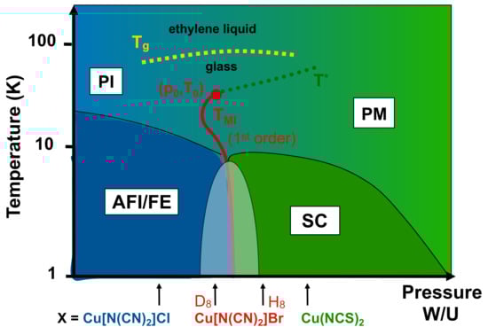 Schematic temperature–pressure phase diagram of the -(BEDT-TTF)X salts with polymeric anions, after Refs. [17,18,19,20,21]. Indicated is the position of systems with different anions X at ambient pressure. Hydrostatic pressure can be mapped on an increasing ratio of (see text). PI, PM, AFI, FE and SC stand for the paramagnetic insulating, paramagnetic metallic, antiferromagnetic insulating, ferroelectric and superconducting phase, respectively. The red line marks the first-order Mott metal-insulator transition, which terminates in a finite-temperature critical point. At elevated temperatures, a structural glass-like transition of the ET molecules’ ethylene endgroup rotational degrees of freedom occurs (dashed yellow line). The green dotted line marks the crossover to an anomalous metallic (’bad metal’) phase above the Fermi liquid.