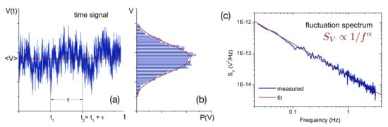 Naturally, large fluctuations about the mean value are unwanted and therefore are sought to be suppressed or largely eliminated. Fluctuation spectroscopy is a time-resolved electronic transport measurement, either of a sample’s resistance (preferred for conducting metallic samples) or its conductance (preferred for semiconducting/insulating samples), where the fluctuations are amplified instead by a suitable measurement system and analyzed in the time and frequency domain by means of simple Fourier analysis, i.e., here “the noise is the signal” [26,27]. The basics of noise and fluctuations are described in many textbooks on (non-equilibrium) statistical physics and time-dependent statistical mechanics, as well as in review articles on noise in condensed matter systems (see e.g., [9,28,29,30,31,32,33,34] and references therein). Therefore, in the following, we will only give a brief account of the important definitions, relevant relations and simple models.