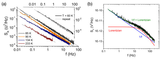 Typical noise spectra. (a) representative resistance noise PSD of an organic charge transfer salt measured at different temperatures. Lines are fits to . Reprinted with permission from [60]. Copyright (2009) by the American Physical Society; (b) voltage noise PSD with a Lorentzian contribution superimposed in the -type background.