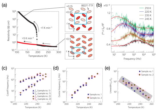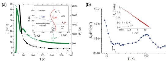 - As shown in [93], the systems -(ET)X with X = Cu[N(CN)]Cl,Cu[N(CN)]Br, or Cu(SCN) show a similar behavior in above about 50 K (see also Figure 11a–c below), which will be explained in this section. In contrast, for K the temperature characteristics of the noise PSD strongly depends on the position in the phase diagram and is strongly enhanced for systems with stronger electron–electron correlations being located closer to the Mott transition [138].