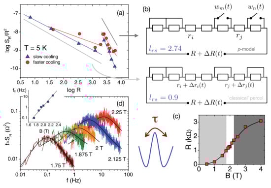 Percolation models in superconductors. (a) scaling of the normalized noise of -Cl in a representation vs. , where the slope reveals the power-law exponent , for data taken at K and different magnetic fields up to 4 T as an implicite tuning parameter of the sample resistance (see (c)); (b) schematics of classical (bottom) and novel (top) percolation noise. In the former case (), the noise originates from the resistor elements, where the short-circuits represent superconducting subvolumes. The latter case of p-noise () originates from switching elements controlled by random processes representing subvolumes with unstable superconductivity, after [72]. Reprinted with permission from [9]. Copyright (2011) John Wiley and Sons; (c) magnetoresistance at K. Light and dark gray areas denote different percolation regimes characterized by the scaling exponent . In the white area, Lorentzian spectra are superimposed on the background noise (see (d)), where the inset shows the shift of the corner frequency . (a,d) reprinted with permission from [68]. Copyright (2009) by the American Physical Society.