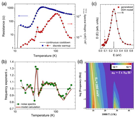 Noise spectroscopy and DDH analysis (see text) on fully-deuterated -(D-ET)Cu[N(CN)]Br. (a) resistance (blue squares) and integrated noise PSD (red circles) of a fully-deuterated sample -(D-ET)Cu[N(CN)]Br; (b) corresponding frequency exponent (green circles) and model calculation within the generalized DDH model (Equation (16)) (red line); (c) distribution of activation energies at Hz calculated using Equation (18). Arrows indicate the two strongest maxima at 260 meV and 90 meV; (d) contour plot of the relative noise level vs. frequency f and temperature T in an Arrhenius representation. The slope of the white line corresponds to an activation energy of meV, corresponding to the maximum in in (c) as extracted from the DDH model. Reproduced from [92,93]. Copyright IOP Publishing.