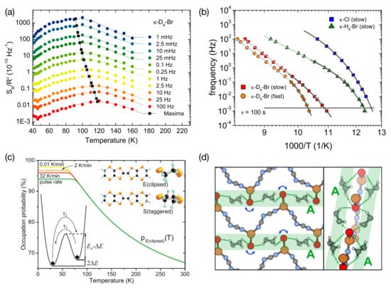 This a posteriori assignment provides a spectroscopic tool to investigate the slow dynamics of the EEG, which undergo a glassy freezing at a characteristic temperature . Figure 8a,b show the position of the peak in of the same sample -D-Br discussed in Figure 7a–c for different frequencies in our measurement window of 1 mHz–100 Hz. (Note that in Figure 7a the spectral weight over the full frequency range is shown.) As seen in Figure 8b for -D-Br, the data at higher frequencies show an Arrhenius behavior, where the slope corresponds to an activation energy of 260 meV corresponding to the maximum in shown in Figure 7c. At lower frequencies towards the glassy freezing transition (which may be defined by a characteristic relaxation time of s), however, the slowing down of the molecular motions coupled to the resistance fluctuations is much stronger, resulting in a curvature that can be described by the empirical Vogel–Fulcher–Tammann law