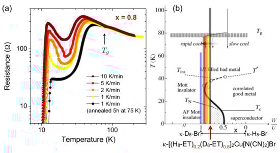 - Taniguchi, H.; Kawamoto, A.; Kanoda, K. Superconductor-insulator phase transformation of partially deuterated κ-(BEDT-TTF)2Cu[N(CN)2]Br by control of the cooling rate. Phys. Rev. B 1999, 59, 8424–8427. [Google Scholar] [CrossRef]