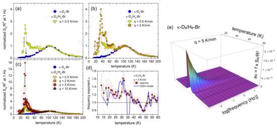 Introducing the function in Equations (15) and (16) is a generalization of the original DDH model [100,101,102]. The function accounts for an explicit temperature dependence of the distribution of activation energies. The physical meaning is that the coupling constant between the random processes and the resistance, and hence the total noise magnitude, may not be independent of temperature. As described in detail in [93], we have assumed the simplest case of a power law , where b describes a constant vertical shift of as compared to the measured . For the measurements in Figure 7b, the best description of the data is found for for (no offset) and for resulting in a vertical offset. As for the physical meaning of the function , a temperature dependence of the number and/or coupling strength of the fluctuators is discussed [102,103]. Figure 7b shows that, for the deuterated -D-Br system, an excellent agreement is observed between the calculated and measured frequency exponent, where nearly every feature of the non-monotonic temperature dependence is quantitatively reproduced. This justifies the conversion of the temperature axis using and determining from Equation (18) shown in Figure 7c. The broad noise peak at about 100 K in Figure 7a therefore corresponds to a peak in centered around meV ( K). (Note that the contour plot Figure 7d of the relative noise level in an Arrhenius plot consistently reveals a slope of the noise maximum corresponding to the same energy.) Energy of this order is well known in -(ET)X as the activation energy of structural, orientational degrees of freedom of the ET molecules’ EEG undergoing a glass-like freezing at K and has been determined, e.g., in NMR [104,105], and thermal expansion and specific heat measurements [19,84] for the thermodynamic glass transition (see also [2]). Therefore, the fluctuators causing the enhanced noise at elevated temperatures can be assigned a posteriori to the thermal motion of the EEG, emphasizing the strong coupling of lattice vibrations to the electronic system.