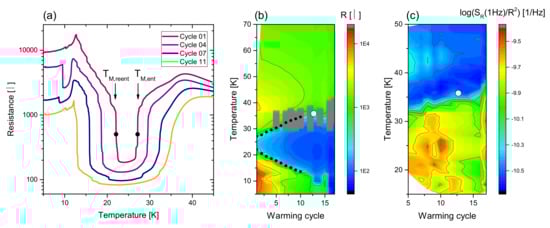 Figure 4a shows typical -type noise spectra representative for organic charge-transfer salts (taken from [60]), and (b) a typical spectrum where a Lorentzian contribution is superimposed on the background. The latter spectrum can be well described by these two separate contributions, which allows for determining both the magnitude of the -noise level and the magnitude and characteristic frequency of the Lorentzian two-level switching, cf. Equation (14) below. The meaning of the fluctuating resistance (or voltage) as a statistically stationary variable is nicely visualized by the reproducibility of the -spectra taken at K (see Figure 4a), showing that, while the noise is random, its PSD is not. The black spectrum has been taken during cool-down of the sample in discrete steps and the light-gray colored spectrum several days later during warm-up. At all temperatures, very clean -spectra with around 1 are observed. One then evaluates the temperature dependence of the slope, (see Section 3.2 below), and the temperature dependence of the noise magnitude where often the value at 1 Hz, conveniently is considered or the spectral weight in some finite frequency interval is calculated.