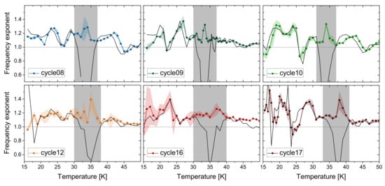 The logarithmic factor in ensures that at the temperatures and frequencies, where -noise is usually observed, the characteristic energies eV are of the same order as ordinary activation energies in solids [33]. The frequency exponent calculated with Equation (16) can then be compared to the measured slope of the spectra