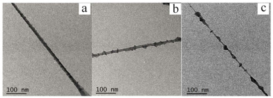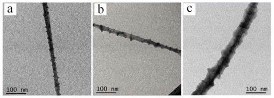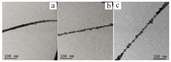 The evolution of kebabs with the isothermal crystallization time was also detected. The morphologies of PE21M crystals on SWCNTs in p-xylene at 50 °C for different isothermal crystallization times are shown in Figure 2 and the average sizes of PE21M lamellae are summarized in Table 2. The average diameter of the PE21M kebab crystals is 10.3 ± 0.8 nm after 3 h isothermal crystallization and the continued growth during the subsequent 3 h leads to the diameter of kebabs reaching 20.2 ± 1.1 nm, i.e., the size doubled with respect to the former 3 h. The average growth rate of kebabs is about 3 nm·h−1 in the elapsed 6 h, which is far below that of PE21F (20 nm·h−1) [36]. This suggests that the speed of PE21M chain lateral growth is limited by the bulkier substituent. According to the average diameter shown in Table 2, we can find that the diameter of kebab crystals reaches 22.4 ± 0.9 nm after 12 h isothermal crystallization, almost unchanged compared with the isothermal crystallization for 6 h. It can also be observed from Table 2 that little change happens for the thickness and periodicity of kebabs formed at the same crystallization temperatures, which further indicates that the thickness and periodicity of kebabs is directly related to the isothermal crystallization temperatures.