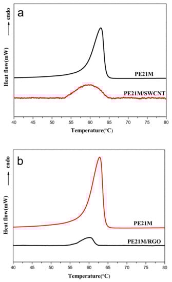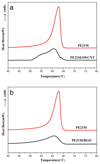 First heating curves of PE21M and PE21M/nanofiller composites in DSC measurement at a constant heating rate of 10 °C/min. (a) PE21M/SWCNT nanocomposites, and (b) PE21M/RGO nanocomposites.