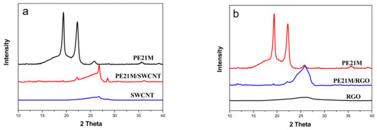 XRD diffractograms of PE21M, nanofillers, and PE21M/nanofiller composites. (a) PE21M/SWCNT nanocomposites, and (b) PE21M/RGO nanocomposites.
