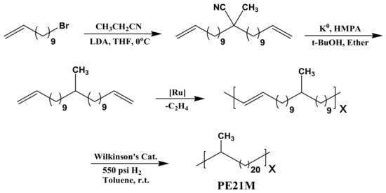 - Smith, J.A.; Brzezinska, K.R.; Valenti, D.J.; Wagener, K.B. Precisely Controlled Methyl Branching in Polyethylene via Acyclic Diene Metathesis (ADMET) Polymerization. Macromolecules 2000, 33, 3781–3794. [Google Scholar] [CrossRef]