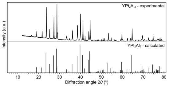 A careful analysis of the obtained intensity dataset of YPt2Al3 revealed an orthorhombic C-centered lattice. The centrosymmetric group Cmmm was found to be correct during structure refinement. A systematic check of the Pearson database [3], using Pearson code oC48 and Wyckoff sequence q2pji2hedb, gave no matches; hence, YPt2Al3 must be considered a new structure type. The starting atomic parameters were obtained using SuperFlip [23], implemented in Jana2006 [24,25]. The structure was refined on F2 with anisotropic displacement parameters for all atoms. As a check for the correct composition and site assignment, the occupancy parameters were refined in a separate series of least-squares cycles. All sites were fully occupied within three standard deviations. No significant residual peaks were evident in the final difference Fourier syntheses. At the end, the positional parameters were transformed to the setting required for the group-subgroup scheme discussed below. Figure 1 depicts the X-ray powder diffraction pattern of YPt2Al3 along with the calculated pattern obtained using the positional information from the single-crystal structure refinement.