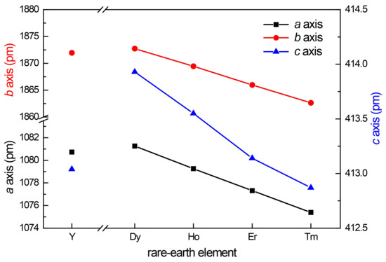The isostructural aluminum compounds of the REPt2Al3 series (RE = Y, Dy–Tm) crystallize in the orthorhombic crystal system, space group Cmmm, Pearson code oC48 and Wyckoff sequence q2pji2hedb. The lattice parameters (Figure 2) and unit cell volumes (Table 1) decrease from the dysprosium to the thulium compound, as expected, from the lanthanide contraction. The lattice parameters of the yttrium compound are in the same range, explainable by the similar ionic radii (Y3+: 90 pm; Dy3+: 91 pm; Ho3+: 90 pm [28]).