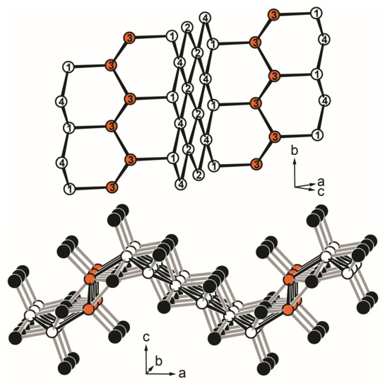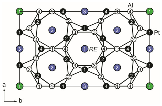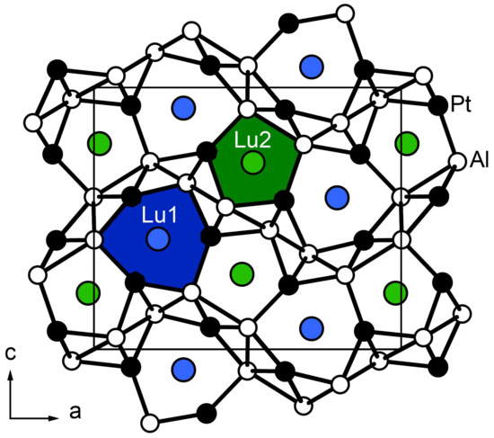 Tm2Pt3Al4 and Lu2Pt3Al4 crystallize in the orthorhombic crystal system with space group Pnma (oP36, c9) in the Ce2Ir3Sb4-type structure [26,27]. In the following paragraph, Lu2Pt3Al4 will be used for the structure description. As in the REPt2Al3 series, the platinum and aluminum atoms form a network. Figure 6 depicts the extended unit cell along [010], and the polyanionic [Pt3Al4]δ– network and the two different lutetium sites are highlighted. The heteroatomic Pt–Al distances span a larger range (246–269 pm) compared to YPt2Al3; however, Pt–Al bonding is still present. In contrast to YPt2Al3, only additional Al–Al bonds can be found ranging from 278 to 300 pm. In the polyanion, no Pt–Pt bonds below 400 pm are found. The Al atoms form corrugated layers consisting of rectangles and hexagons in the boat conformation (Figure 7, top) that are capped by the Pt atoms (Figure 7, bottom).