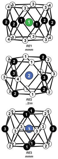 Coordination polyhedra surrounding the three crystallographically independent yttrium sites in YPt2Al3. Yttrium, platinum, and aluminum atoms are drawn as green/blue, black-filled, and open circles, respectively. The local site symmetries are given.