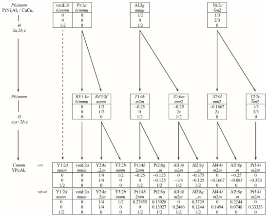 A view of the unit cell along the c axis readily reminds us of the ternary CaCu5-type derivatives PrNi2Al3 [15], YNi2Al3 [16], DyNi4Si [34], CeCo3B2 [14], and the recently found i7 superstructure of PrNi2Al3 [17]. Recoloring in intermetallics is found quite frequently, often accompanied by distortions and puckering within the respective structures [35]. These structural effects between different structure types can be investigated by so-called group-subgroup relations. The structures of PrNi2Al3 and YPt2Al3 are related by such a group-subgroup scheme, which is presented in the Bärnighausen formalism [36,37,38,39] in Figure 5. In the first step, an isomorphic symmetry reduction of index 4 takes place, which causes a doubling of the a and b axis, along with a splitting of the Pr (1a to 1a and 3f), Ni (2c to 2c and 6l), and Al (3g to 6k and 6m) sites. In the second step a translationengleiche transition of index 3 takes place, reducing the hexagonal symmetry from space group P6/mmm to orthorhombic Cmmm. Again, a splitting of the crystallographic position occurs along with the introduction of additional degrees of freedom regarding the crystallographic positions. This enables a distortion of the polyanion and a recoloring of the crystallographic sites. The Y1 atoms finally occupy the 2d rather than the 2a site as suggested by the group-subgroup scheme. Hence, they are shifted by 1/2 z compared to the original position. The same shift is also observed in YNi2Al3 [16,35] and i7-PrNi2Al3 [17]. Refinement as orthorhombic trilling, as suggested by the translationengleiche symmetry reduction of index 3, is not necessary because the orthorhombic crystal system was found directly by the indexing routine.