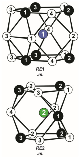 The lutetium cations occupy two distinct crystallographic sites and are again found in the cavities of the polyanion. Lu1 is surrounded by 16 atoms in a four-fold-capped hexagonal prismatic environment (Lu1@[Al6Pt6+Al4]; Figure 8, top), while Lu2 has a three-fold-capped pentagonal prismatic coordination sphere (Lu2@[Al6Pt4+Al2Pt]; Figure 8, bottom). The Lu–Pt distances range from 299 to 310 pm, and the Lu–Al distances range from 327 to 347 pm. The Lu–Pt distances are in line with LuPtAl; the Lu–Al contacts are significantly longer (Lu–Pt: 302–327 pm; Lu–Al: 284–301 pm) [30].