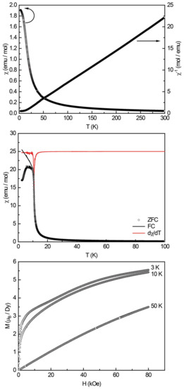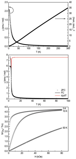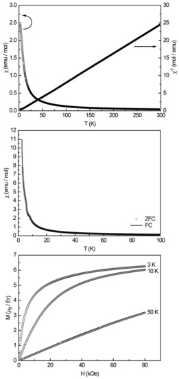 The magnetic properties of DyPt2Al3, HoPt2Al3, ErPt2Al3, and TmPt2Al3 have been depicted in Figure 10, Figure 11, Figure 12 and Figure 13. The top panels always depict the susceptibility and inverse susceptibility data (χ and χ–1). The effective magnetic moments have been obtained from fitting the χ–1 data using the Curie–Weiss law between 50 and 300 K. They were calculated from the Curie constant according to [40,41]. All rare-earth atoms are in the trivalent oxidation state; the effective magnetic moments compare well within the calculated moments, as stated in Table 9. The calculated moments are tabulated [40,41] or can be calculated according to with [40,41].