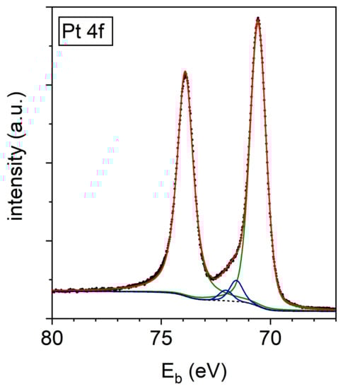 XPS was performed using an ESCALAB 250 Xi instrument (Thermo Fisher, East Grinsted, UK) with mono-chromatized Al Kα (hν = 1486.6 eV) radiation. All samples were cleaned by Ar+ sputtering (MAGCIS ion gun, 36 keV) for 60 s to remove adventitious carbon. High-resolution spectra were measured with pass energies of 10 eV (Pt 4f, Al 2s, Al 2p, and C 1s) and 20 eV (Y 3d and Pr 3d). Peak deconvolution was performed using a Gaussian-Lorentzian peak shape by the software Avantage (Thermo Fisher). All spectra were referenced to remaining adventitious carbon at 284.8 eV. Because of the overlap of the Pt 4f and Al 2p signals, Al 2s was used for Al quantification. The obtained data are summarized in Table 10.