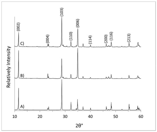 XRD pattern of BICUTIVOX platelets produced via MSS: (A) 650 °C/8 h, (B) 675 °C/8 h, (C) 700 °C/8 h.