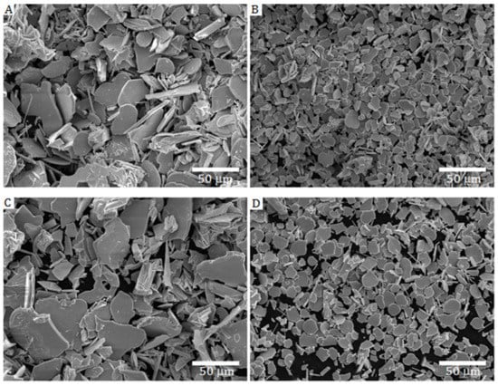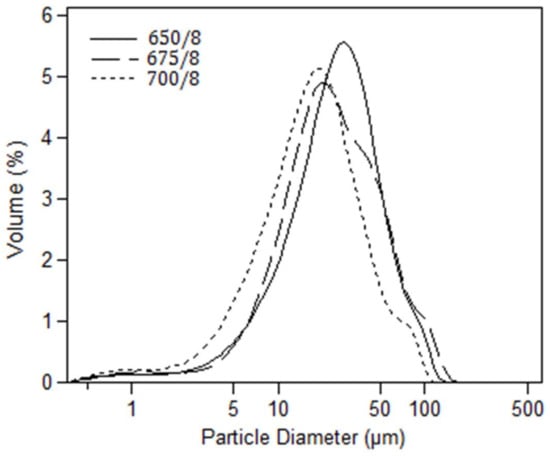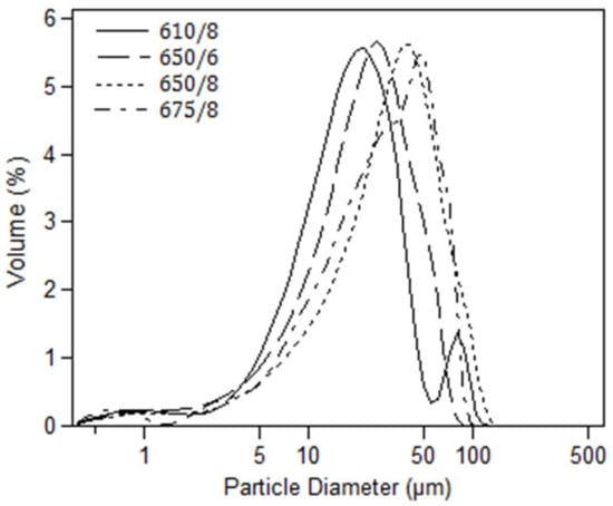 Figure 2 shows SEM images of MSS BICUVOX. The 610/8 material appears to consist largely of agglomerates of small platelets. Although 610 °C is substantially lower than the reported eutectic temperature of 640–657 °C [], the solid salt still facilitates habit growth by enhancing the diffusion of ions []. With higher process temperatures and the presence of a fully molten salt, larger platelets result, with a majority of the faces having an irregular shape. An inspection of additional micrographs suggests that the highest temperature (675 °C) also gives a greater population of smaller crystallites, resulting either from fracture or from larger platelets dissolving and re-nucleating as described [,,]. An increase in population of broken and/or re-dissolved and nucleated particles is believed to be the cause of the decrease in (00l) reflections for the 675 °C processed material. Figure 3 shows the distribution of particle sizes as measured by laser diffraction. As expected, the major mode shifts to a larger particle size with a process temperature and time, which is in general agreement with the SEM images. For the solid-salt synthesis at 610 °C, the small mode at a large size of about 80 microns is attributed to aggregation. For the 675 °C material, the shoulder located at about 30 μm off of the major peak can be attributed to broken platelets.