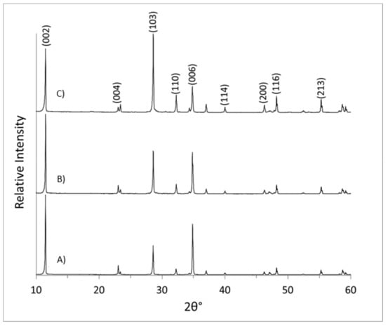 The diffraction patterns in Figure 4 show that the γ-phase for BICUTIVOX was also synthesized in all heat treatments. Again, all three patterns show higher (00l)/(103) intensity ratios than a random powder pattern []. In this case, there is a steady decrease in powder texture with an increasing synthesis temperature.
