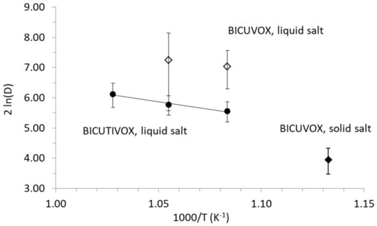Plot of 2ln(D) (D = platelet diameter) versus inverse temperature for salt-synthesized BICUVOX and BICUTIVOX according to the particle growth model. Error bars show ± one Dstdev.