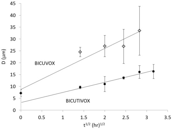 Platelet diameter versus the square root of time plots for BICUVOX and BICUTIVOX at an MSS process temperature of 650 °C. Exception: The solid point at t = 0 is the experimental grain size of BICUVOX measured from solid salt synthesis at 610 °C, and it is taken as an approximation of the starting grain size (error bars show ± one Dstdev).