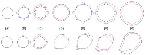 Figure 10 is a schematic which aids the description of the platelet growth and provides an explanation for their quasi-equilibrium, multifoil shapes. The top row represents BICUTIVOX. The bottom row represents BICUVOX. In general, particles of Aurivillius-type, bismuth, layered-structure compounds are expected to have atomically smooth (00l) faces and atomically rough (hk0) faces [], so high surface area sites nucleate along the propagating edge of a platelet (Figure 10B). During Ostwald ripening, a kinetic restriction (surface diffusion) regulates the growth of the platelets but does not affect the 2D-nucleation rates for the ledge generation. In BICUTIVOX, nucleation of ledges (with fast kinetics) is distributed evenly about the perimeter of the crystallite, and so, the growth of the propagating edge happens evenly in all directions (Figure 10C). The nucleation–growth process repeats itself as the particle grows (Figure 10D–G). For some particles, the process is interrupted at the nucleation stage while others are interrupted at the edge growth stage or somewhere in-between (see especially Figure 5B). The lobes are more pronounced and more numerous in the higher temperature (700 °C) material because the rate of nucleation is very high. In the case of BICUVOX, the mechanism of platelet growth is the same, except that there is a difference in the speed of edge propagation because the rate constant is higher (as seen in Figure 9). In BICUVOX, soon after the nucleation of a ledge site, the edge begins to grow around it as the cusp fills in due to capillary pressure. Because this growth step happens more rapidly than in BICUTIVOX, the growth does not occur evenly in all directions; thus, this leads to the lack of circularity in BICUVOX platelets.