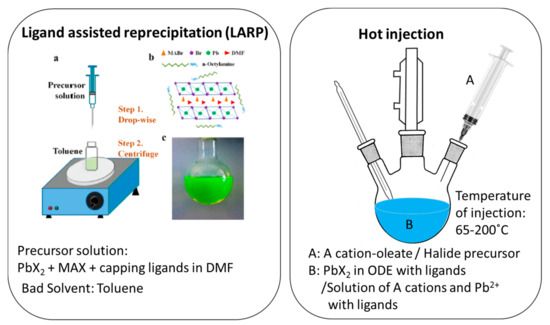- Gonzalez-Carrero, S.; Galian, R.E.; Pérez-Prieto, J. Organic-inorganic and all-inorganic lead halide nanoparticles [Invited]. Opt. Express 2016, 24, A285–A301. [Google Scholar] [CrossRef] [PubMed]