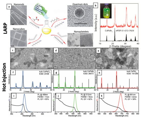 - Sun, S.; Yuan, D.; Xu, Y.; Wang, A.; Deng, Z. Ligand-Mediated Synthesis of Shape-Controlled Cesium Lead Halide Perovskite Nanocrystals via Reprecipitation Process at Room Temperature. ACS Nano 2016, 10, 3648–3657. [Google Scholar] [CrossRef] [PubMed]