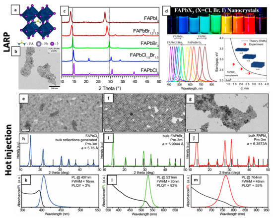 - Levchuk, I.; Osvet, A.; Tang, X.; Brandl, M.; Perea, J.D.; Hoegl, F.; Matt, G.J.; Hock, R.; Batentschuk, M.; Brabec, C.J. Brightly Luminescent and Color-Tunable Formamidinium Lead Halide Perovskite FAPbX3 (X = Cl, Br, I) Colloidal Nanocrystals. Nano Lett. 2017, 17, 2765–2770. [Google Scholar] [CrossRef] [PubMed]