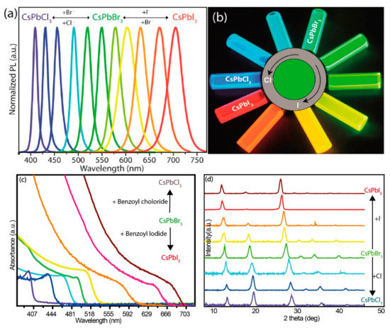 - Guhrenz, C.; Benad, A.; Ziegler, C.; Haubold, D.; Gaponik, N.; Eychmüller, A. Solid-State Anion Exchange Reactions for Color Tuning of CsPbX3 Perovskite Nanocrystals. Chem. Mater. 2016, 28, 9033–9040. [Google Scholar] [CrossRef]