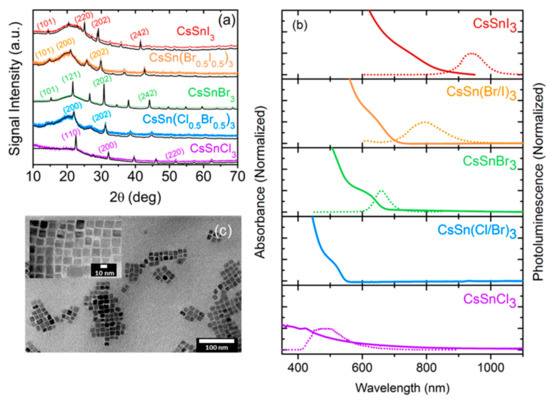 - Jellicoe, T.C.; Richter, J.M.; Glass, H.F.J.; Tabachnyk, M.; Brady, R.; Dutton, S.E.; Rao, A.; Friend, R.H.; Credgington, D.; Greenham, N.C.; et al. Synthesis and Optical Properties of Lead-Free Cesium Tin Halide Perovskite Nanocrystals. J. Am. Chem. Soc. 2016, 138, 2941–2944. [Google Scholar] [CrossRef] [PubMed]