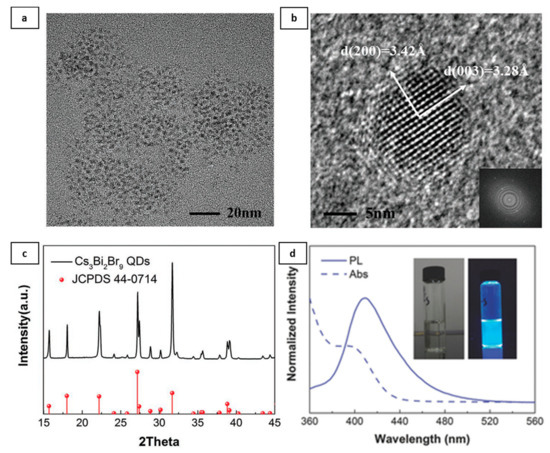 - Leng, M.; Yang, Y.; Zeng, K.; Chen, Z.; Tan, Z.; Li, S.; Li, J.; Xu, B.; Li, D.; Hautzinger, M.P.; et al. All-Inorganic Bismuth-Based Perovskite Quantum Dots with Bright Blue Photoluminescence and Excellent Stability. Adv. Funct. Mater. 2018, 28, 1704446. [Google Scholar] [CrossRef]