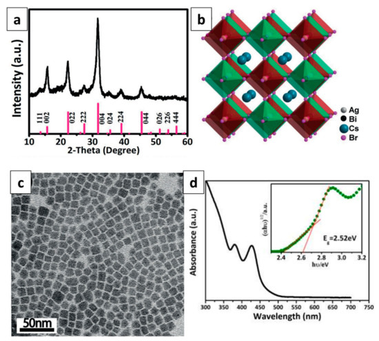 - Creutz, S.E.; Crites, E.N.; De Siena, M.C.; Gamelin, D.R. Colloidal Nanocrystals of Lead-Free Double-Perovskite (Elpasolite) Semiconductors: Synthesis and Anion Exchange To Access New Materials. Nano Lett. 2018. [Google Scholar] [CrossRef] [PubMed]