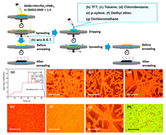 - Paek, S.; Schouwink, P.; Athanasopoulou, E.N.; Cho, K.T.; Grancini, G.; Lee, Y.; Zhang, Y.; Stellacci, F.; Nazeeruddin, M.K.; Gao, P. From Nano- to Micrometer Scale: The Role of Antisolvent Treatment on High Performance Perovskite Solar Cells. Chem. Mater. 2017, 29, 3490–3498. [Google Scholar] [CrossRef]