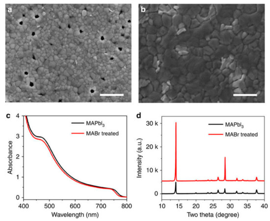 - Yang, M.; Zhang, T.; Schulz, P.; Li, Z.; Li, G.; Kim, D.H.; Guo, N.; Berry, J.J.; Zhu, K.; Zhao, Y. Facile fabrication of large-grain CH3NH3PbI3−xBrx films for high-efficiency solar cells via CH3NH3Br-selective Ostwald ripening. Nat. Commun. 2016, 7, 12305. [Google Scholar] [CrossRef] [PubMed]