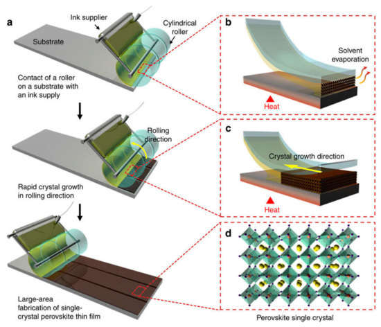 - Lee, L.; Baek, J.; Park, K.S.; Lee, Y.-E.; Shrestha, N.K.; Sung, M.M. Wafer-scale single-crystal perovskite patterned thin films based on geometrically-confined lateral crystal growth. Nat. Commun. 2017, 8, 15882. [Google Scholar] [CrossRef] [PubMed]
