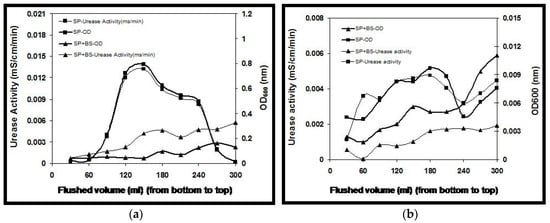 Column 1 and column 2 with monoculture and coculture bacteria were studied to elucidate the distribution of urease activity and optical density over the column length. While flushing 300 mL of bacterial suspension, immediately followed by 300 mL fixation fluid of 50 mM CaCl2 solution, measurement of both optical density and urease activity in the effluent of the sand column showed that a large proportion of the injected bacteria was retained in the column (Figure 1a). Further, after injecting the cementation solution, no noticeable activity or bacteria were observed in the effluent (Figure 1b). The effluent measurements showed that bacteria in the monoculture experiment resulted in more wash-out of cells and activity corresponding to that of coculture. This retainment of more urease activity and optical density in coculture may be attributed to the synergistic relationship between S. pasteurii and B. subtilis, where, in the environment with nutrient limiting conditions or microbes living in deep subsurface, majority of the populations can thrive without any input from the earth’s surface. This might be due to the symbiotic association for their survival where organic compounds or metabolites produced by one bacterial species may be utilized by the other to adapt to the harsh environment.