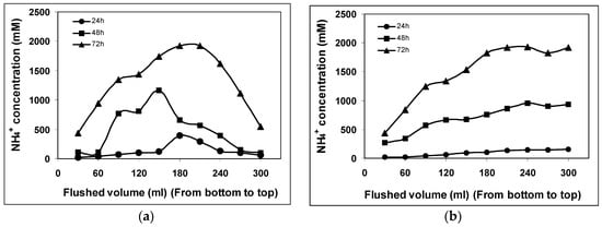 (a) Ammonium concentration measurements in the effluent for monoculture S. pasteurii, which was flushed out after 24 h, 48 h and 72 h respectively; (b) Ammonium concentration measurements in the effluent for coculture of S. pasteurii and B. subtilis, which was flushed out after 24 h, 48 h and 72 h, respectively.