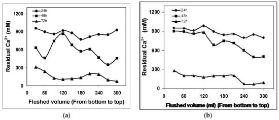 (a) Calcium concentration in the effluent for monoculture S. pasteurii, which was flushed out after 24 h, 48 h and 72 h respectively; (b) Calcium concentration in the effluent for coculture of S. pasteurii and B. subtilis, which was flushed out after 24 h, 48 h and 72 h, respectively.