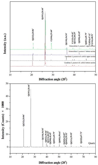 X-ray diffraction of upper and bottom sections for monoculture, coculture. The XRD of quartz only was measured for comparison.