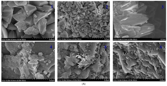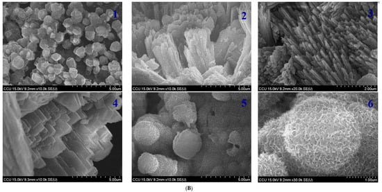 (A): SEM imagines of calcium carbonate precipitated by monoculture bacterial experiments. Top row (for upper part of column) showed the trigonal prism CaCO3 (1 and 2) and rod-shaped calcite (3). Down row (for down part of column) showed the large and compact calcite with the irregular flakes of CaCO3 (4, 5 and 6). (B): SEM imagines of calcium carbonate precipitated by coculture bacterial experiments. Top raw (for down part of column) showed the granular calcite (1) and rod-shaped calcite (2 and 3). Down raw (for upper part of column) showed compact and lamellar calcite (4), and spherulitic vaterite. (5 and 6).