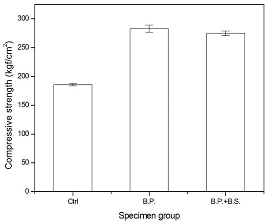 Test results of the compressive strength for the control, SP and SP + BS group specimen at 14 days.