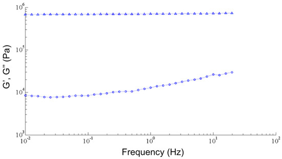 The behavior of viscoelastic materials can be described by their complex shear modulus, , defined as the ratio of the shear stress to the shear strain. The storage modulus, , represents the in-phase (elastic) stress response, while the shear loss modulus, , is related to the dynamic viscosity through . Dynamic mechanical analysis (DMA) is a standard technique for measuring the frequency, temperature dependence, or both, of both moduli. For example, Figure 1 shows a typical variation of both the storage and the loss modulus of a PDMS sample measured at 20 °C. It was obtained with an imposed deformation of 5% with frequencies varying between 0.01 Hz and 20 Hz.