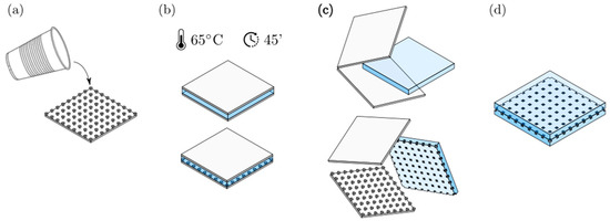 Practical realization of a monolayer bubble crystal in PDMS: (a) The monomer-crosslinking mixture is poured onto a mold; (b) After sealing, the sample is cured for 45 min at 65 °C. The operation is repeated with a second, non-textured mold; (c) After curing, the polymer becomes solid and can be unmolded; (d) The two blocks of PDMS are joined so that the bubbles are isolated from the outside.