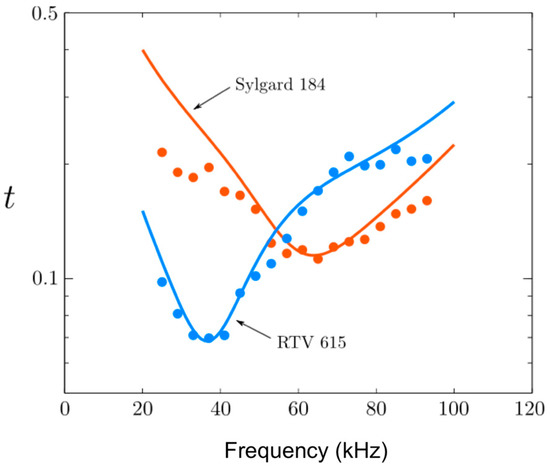 We would like to point out that the gap observed in Figure 4 does not originate from Bragg scattering but rather from hybridization between the free space propagation mode and the bubble Minnaert resonance [13,14]. Such a gap is known to survive disorder [15,16]. The position of the transmission dip is driven by the storage modulus while its height is related to the loss modulus. The inferred values are listed in Table 1. The results confirm that RTV615 is softer and less viscous than Sylgard, which explains why it is preferably used for the fabrication of microvalves.