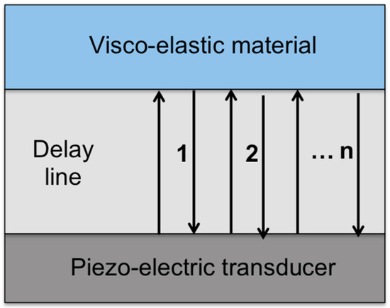 For some polymers, the crystallization phenomenon limits the temperature range which can be explored such that the determination of the shear modulus remains limited to low frequencies. Several strategies based on the measurement of both the velocity and the attenuation of shear waves have been proposed in the past for reaching higher frequencies up to the MHz range. Reflection measurements are preferably used due to the strong attenuation of shear waves in viscoelastic materials at these frequencies. For example, in [17] the authors exploit the echoes reflected at the interface between the sample of interest and a piece of quartz, the latter being used as a delay line. The echoes measured in absence of the sample (i.e., at the quartz/air interface) are taken as a reference. The storage and loss shear modulus can then be determined from the ne echo by taking the ratio of its amplitude to the reference and the difference between its arrival time and the one of the reference (Figure 6).